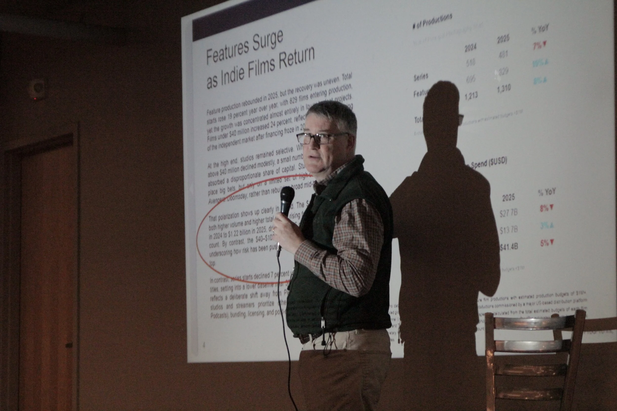 Following a welcome by MFA Co-President Geoffrey Leighton, Co-President Louise Rosen took the floor to announce MFA’s launch of its 2026 Economic Impact Study. The study, in partnership with the Maine Film Office and Department of Economic and Community Development, will be led by Ryan Wallace of Wallace Economic Advisers. Through this comprehensive study, these partners seek to understand the current Maine-based mediamaking workforce and its impact on Maine’s economy, identify opportunities to support and grow the industry in Maine, learn from policy and successes in other states/provinces, and envision future models and scenarios that would bolster the Maine filmmaking industry. All mediamakers in Maine will be prompted to complete a brief survey later this month to inform the study.