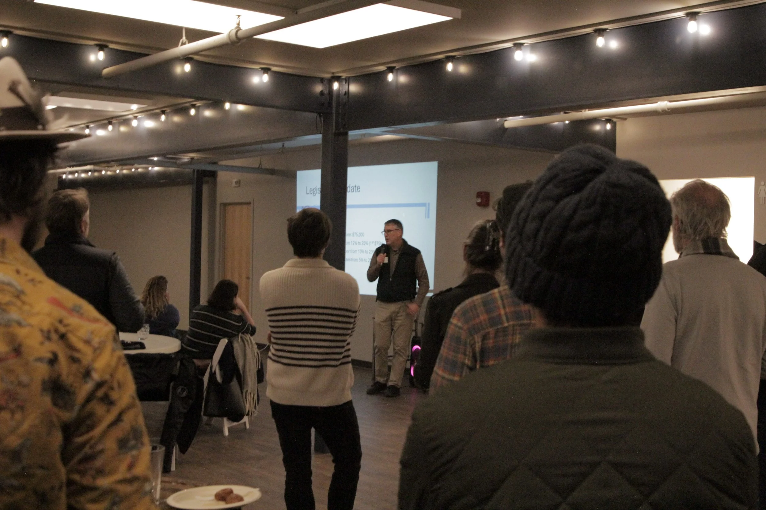 Portland-based screenwriter and producer Desi Van Til shared her insights on the importance of state film incentives for small, independent films. Van Til’s 2015 film Tumbledown, starring Jason Sudeikis and Rebecca Hall and set in Farmington, was unable to be shot in Maine due to the state’s lack of film incentives. She emphasized the make-or-break role that incentives play in creatives being able to fulfill their vision in their ideal location, and the fiscal prudence that investors and producers must exercise in budgeting for a film. The event concluded with a Q&A with Van Til followed by more networking to round off a successful 2026 launch party.